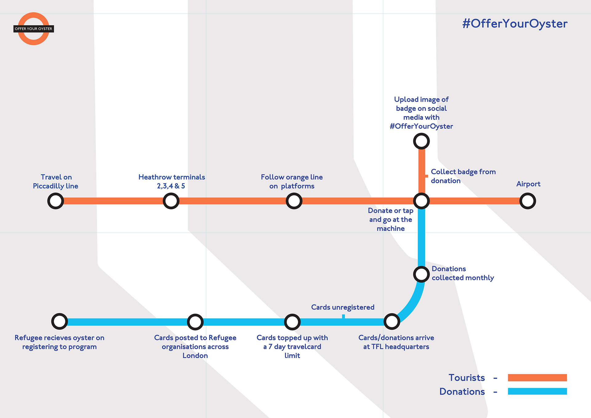 Offer Your Oyster is a TFL led initiative that encourages tourists to help faciltate a Refugees' journey across London, by donating their oyster cards or left over credit at Heathrows underground terminals before flying.